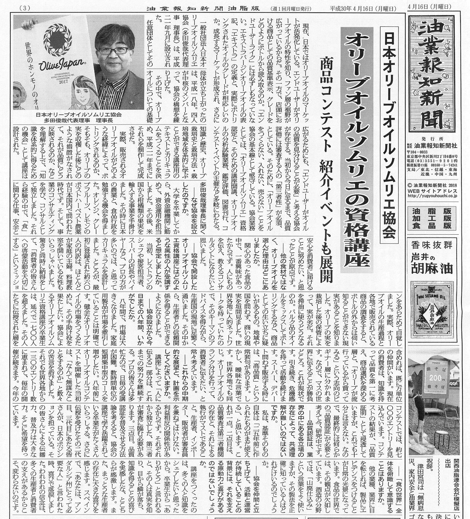 本年度のOLIVE JAPANⓇ 2018 国際オリーブオイルコンテスト開催直前となる4月16日に、油脂業界専門の新聞「油業報知新聞」に当協会の取り組みが3面全面で紹介されました!