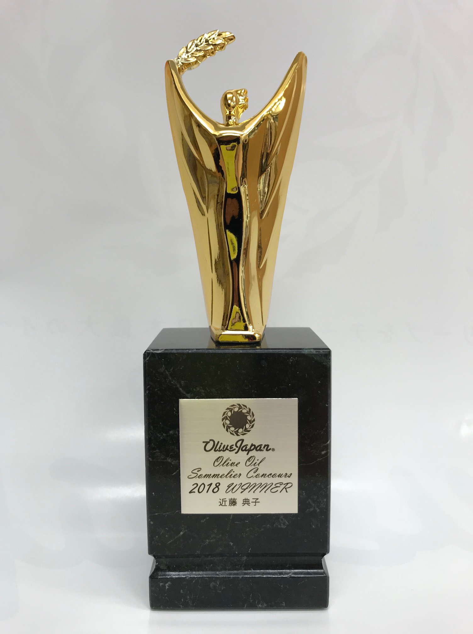 優秀賞受賞者には、記念のトロフィー(第1位のみ)、賞状そして宝石があしらわれた特別なオリーブオイルソムリエバッジが、多田理事長ならびに2018年オリーブアンバサダーに任命された女優の佐藤藍子さんから贈呈されました。